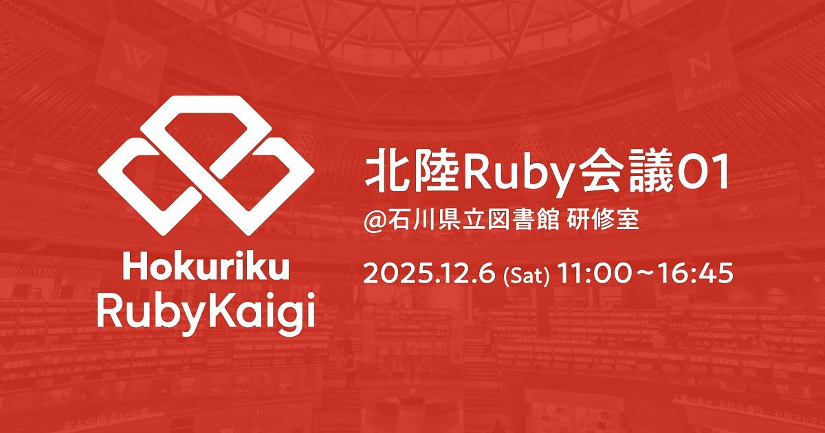- [北陸Ruby会議01](https://regional.rubykaigi.org/hokuriku01)は、北陸三県で活動する、三つのRubyコミュニティが合同で主催されるイベントです。